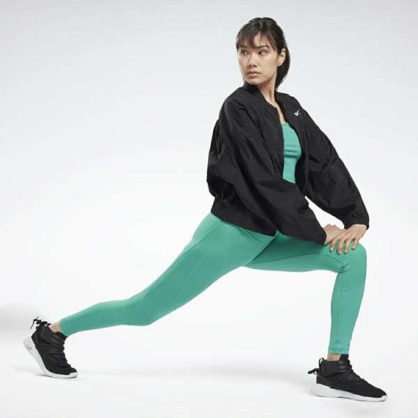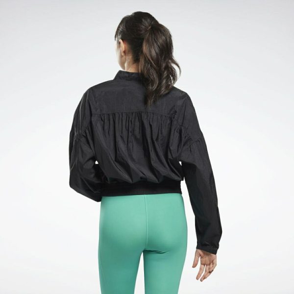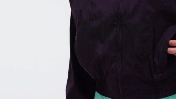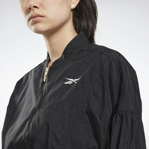 This women’s Reebok jacket is made of shiny crinkle woven material. It has a relaxed bomber silhouette.