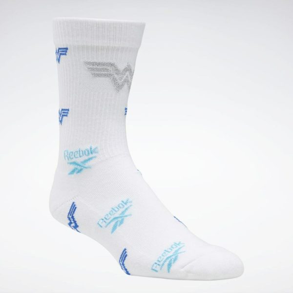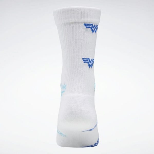 Cruise through your day like a superhero in these Wonder Woman crew socks. They come with toe and heel cushioning for cozy comfort, and feature an allover print of Wonder Woman and Reebok Vector logos.